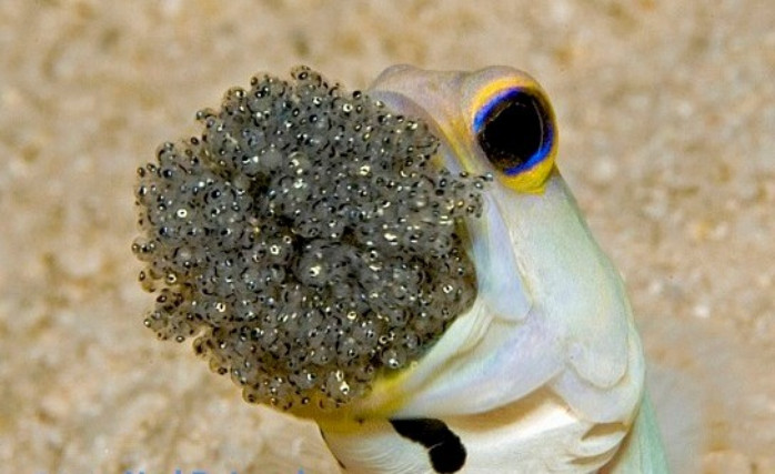 Captured in this snap is a yellow-head with a mouthful of its offspring to incubate them.