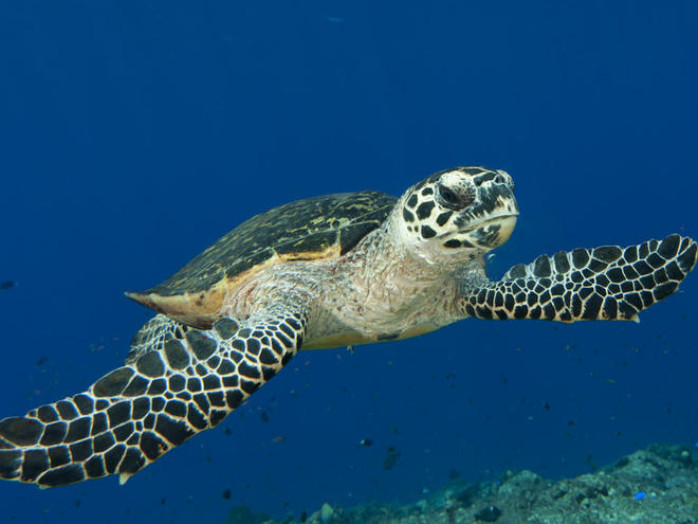 42. A Hawksbill turtle (Eretmochelys imbricata) is captured swimming through a reef.