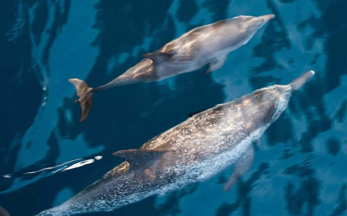 A mother Atlantic spotted dolphin is seen with its calf swimming side by side in the Bahamas.